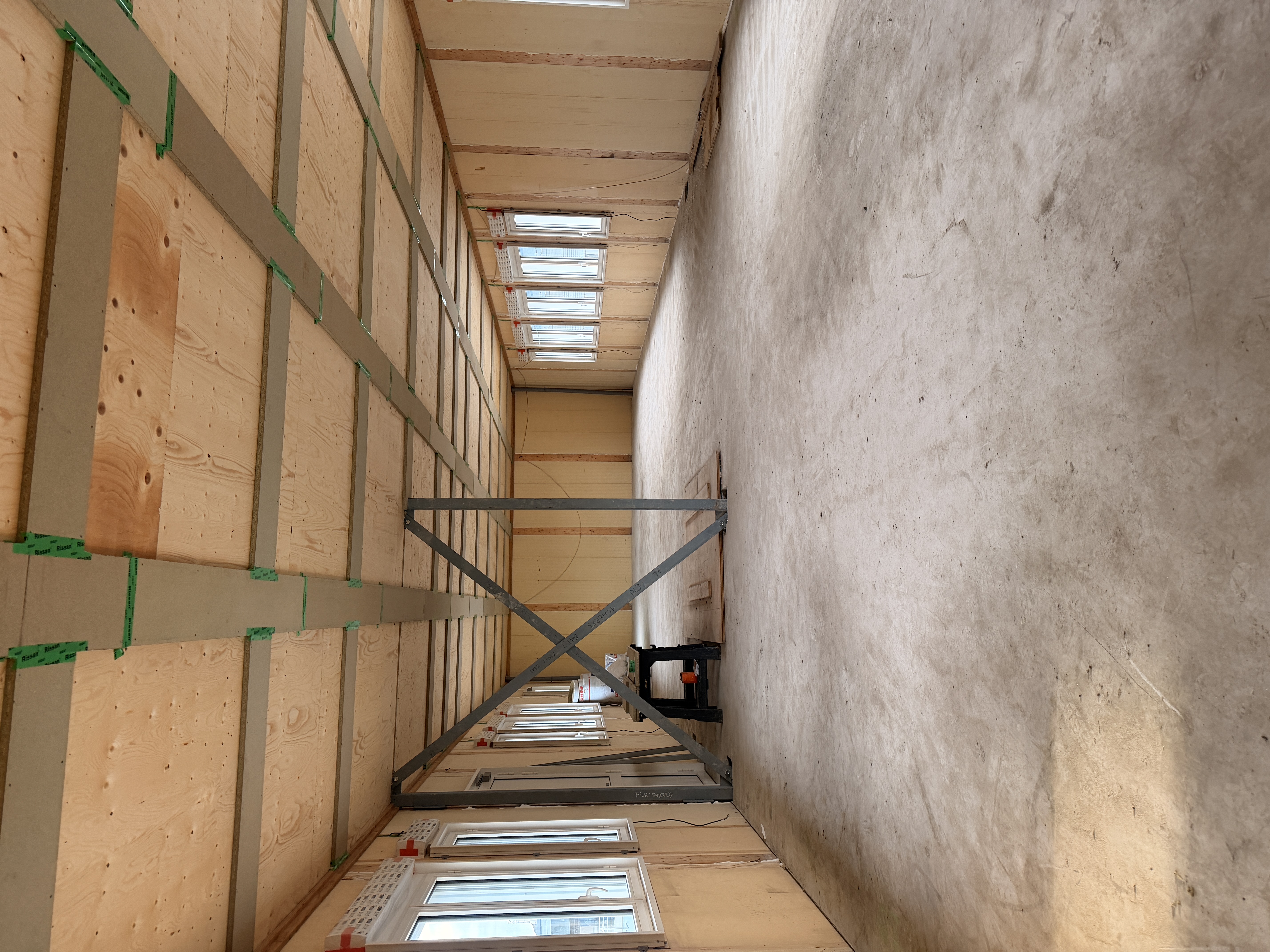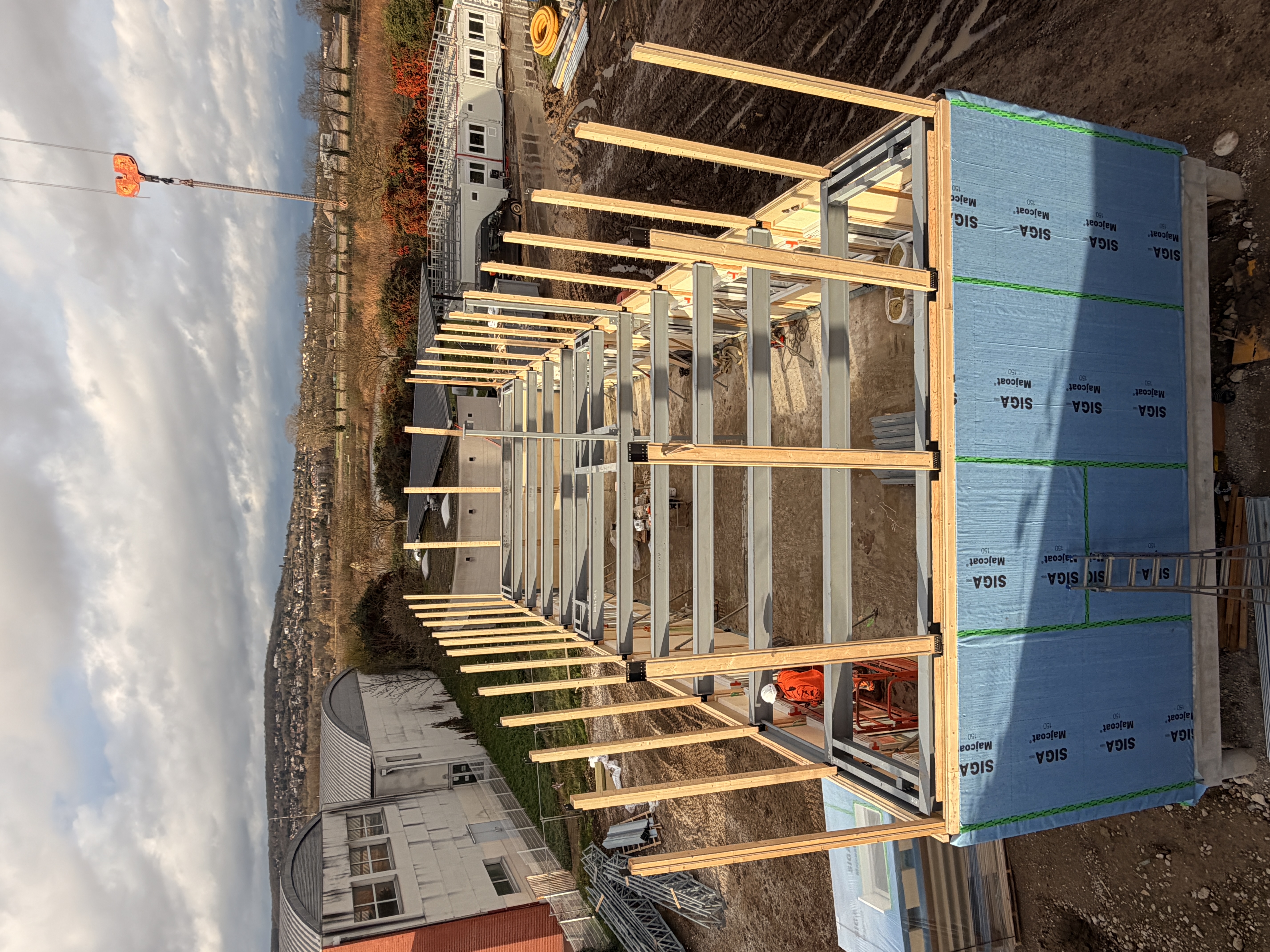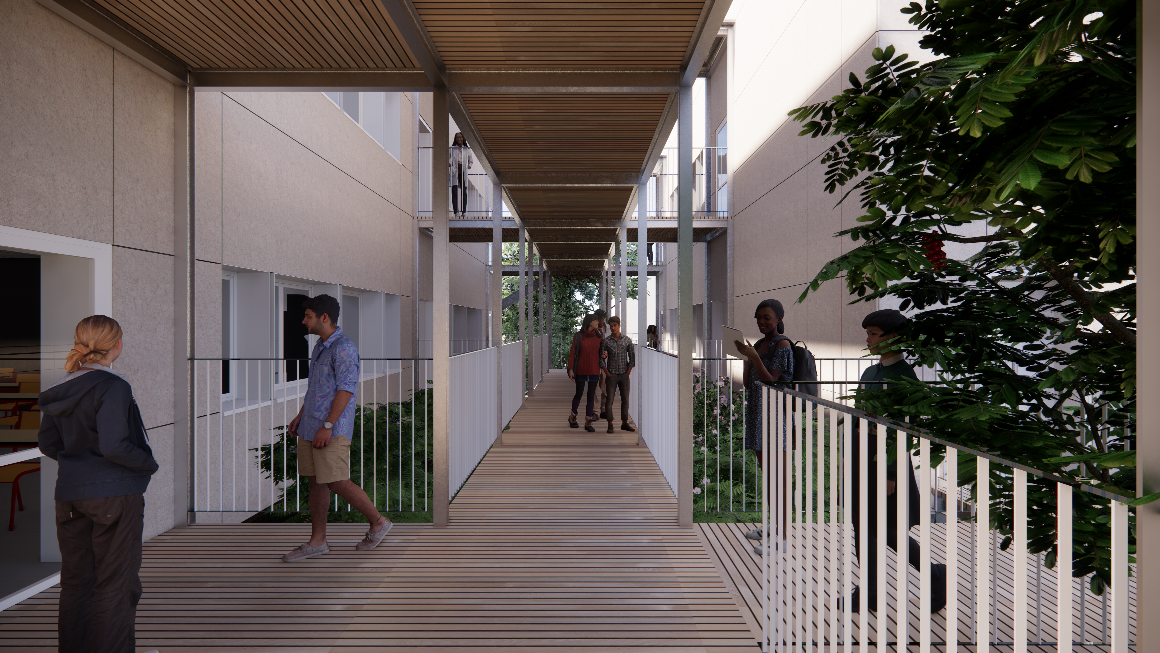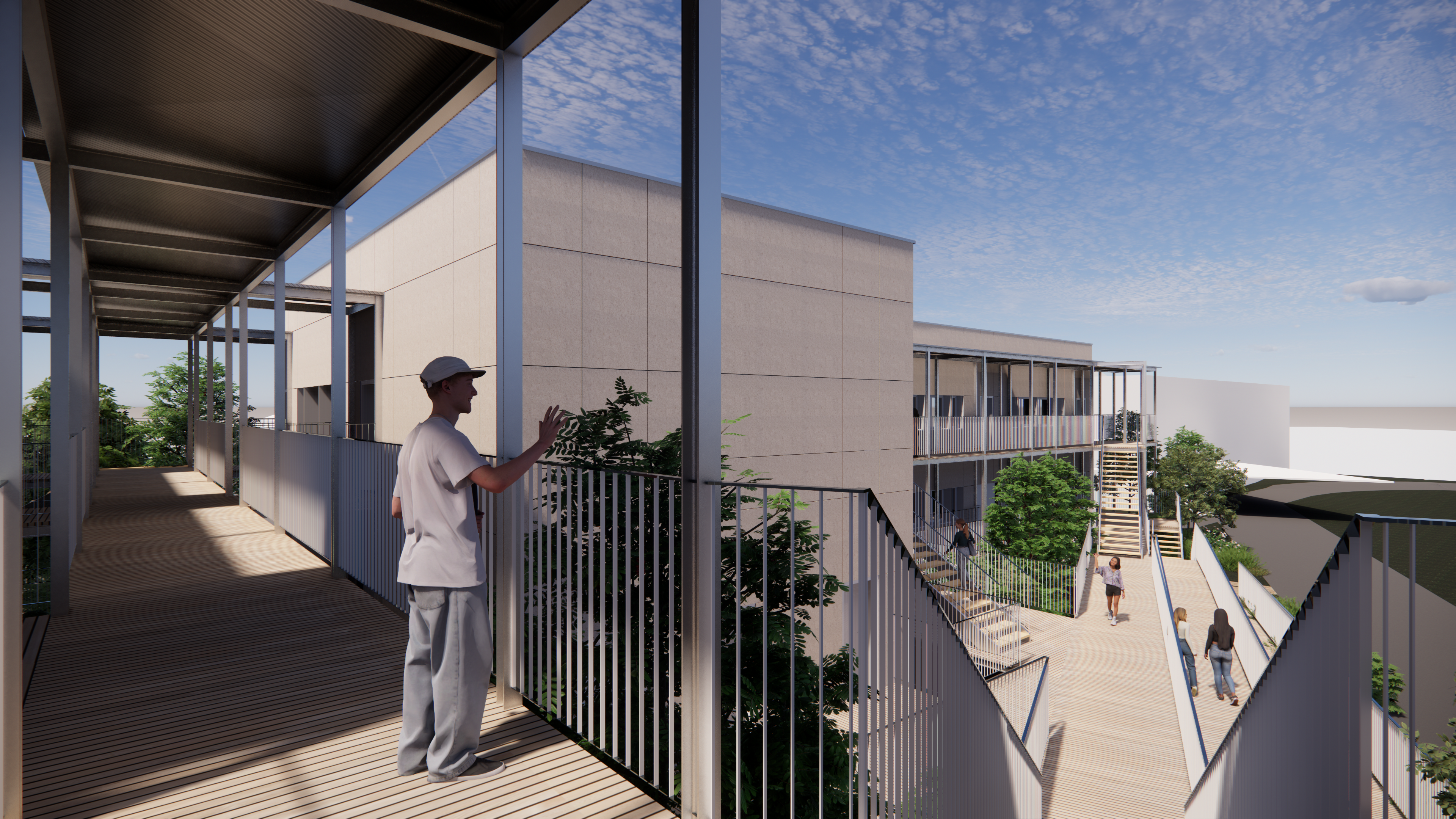 Les passerelles sont composées d’une structure métallique similaire aux poutres du préau existant, d’un platelage en bois et d’une couverture en tôle ondulée.