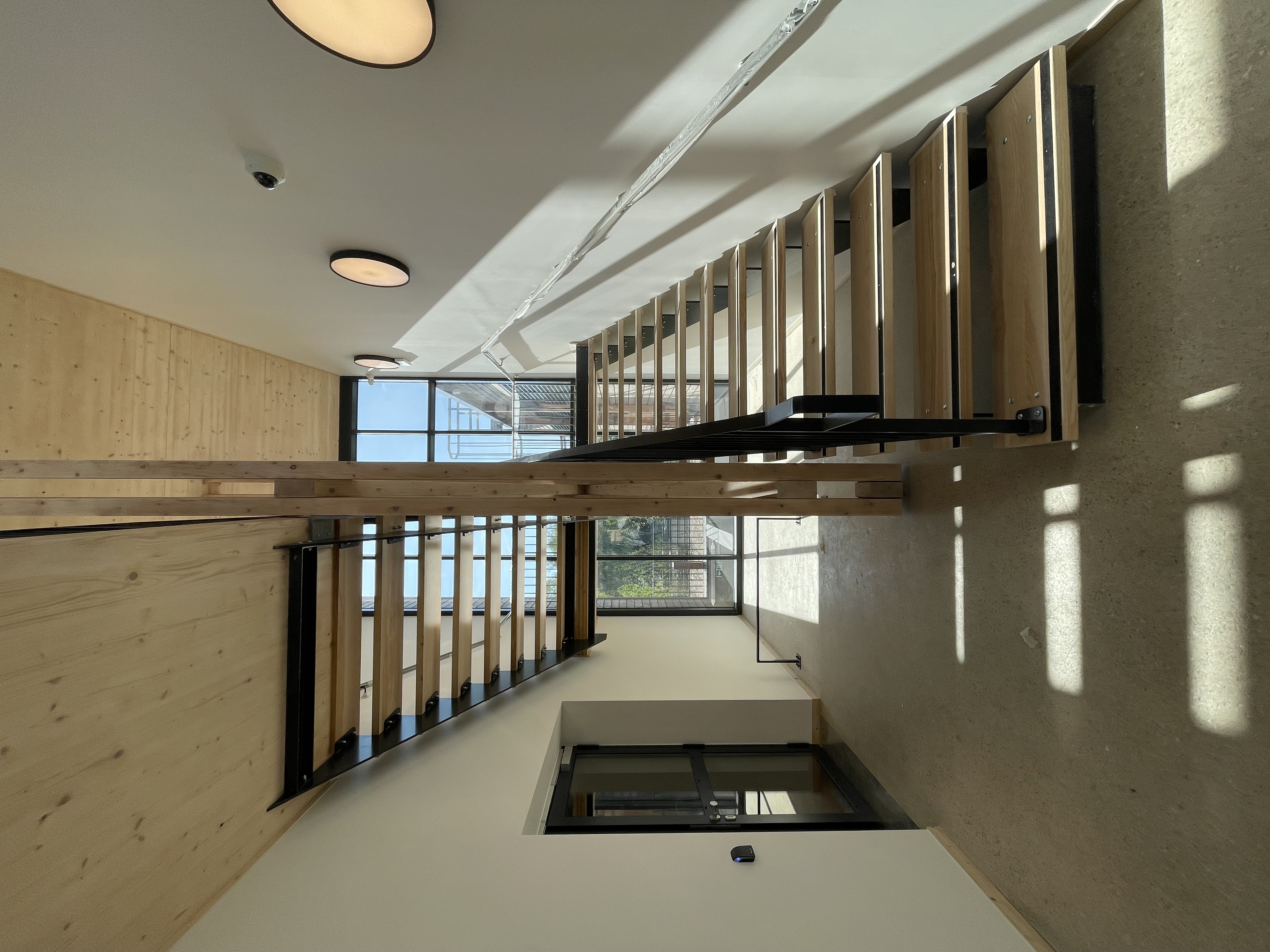 La forme de la parcelle, la volonté d’offrir un parvis aux usagers et la nécessité d’aménager des places de parking nous ont amenés à implanter les chambres de l’internat en retrait de la rue du Prébuart, sur la partie sud de la parcelle, qui est la plus qualitative en termes d’environnement sonore, de vues et de paysage. Le bâtiment des espaces communs fera l’interface entre la rue du Prébuard, le parking, le parvis et les chambres.