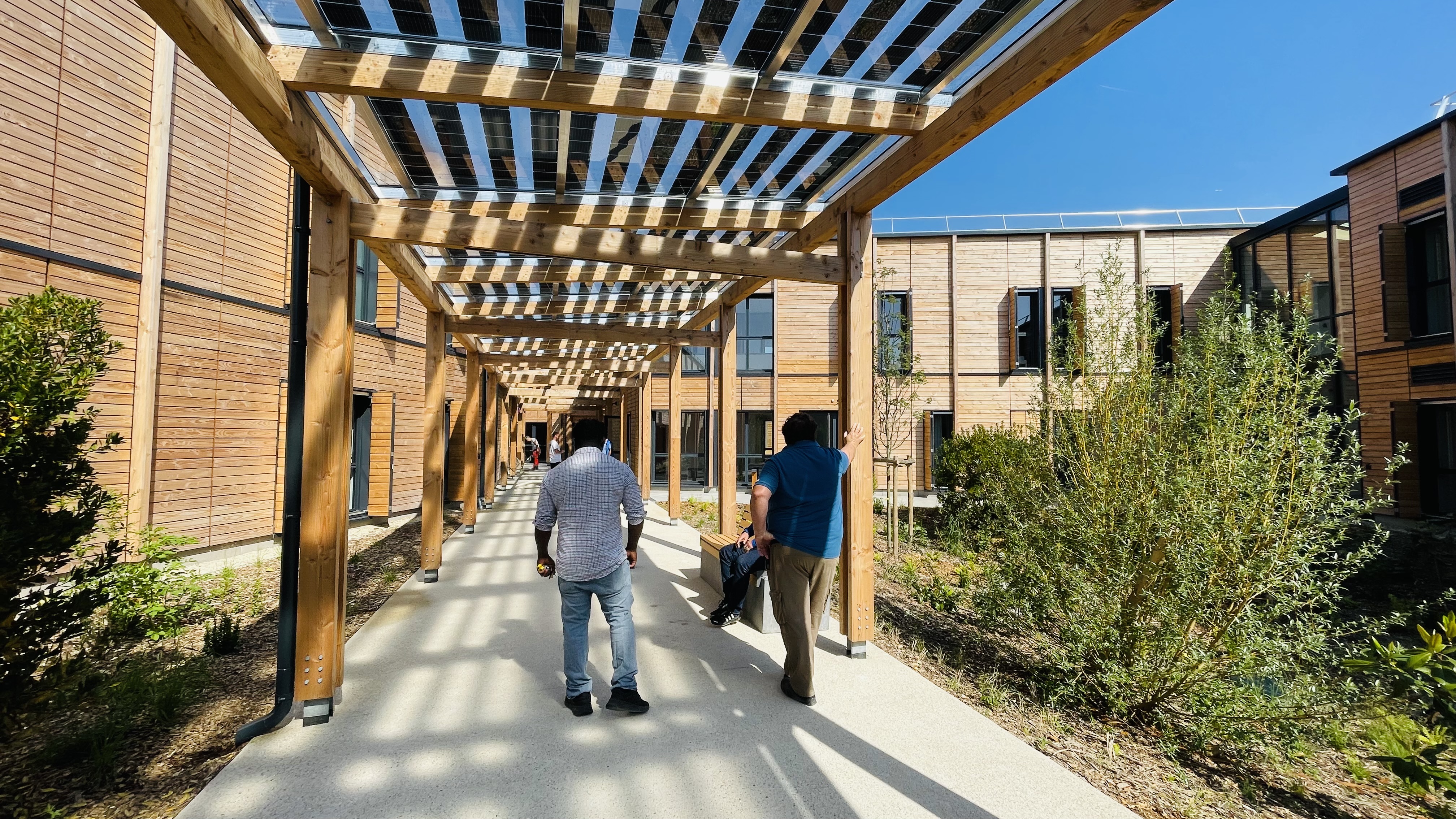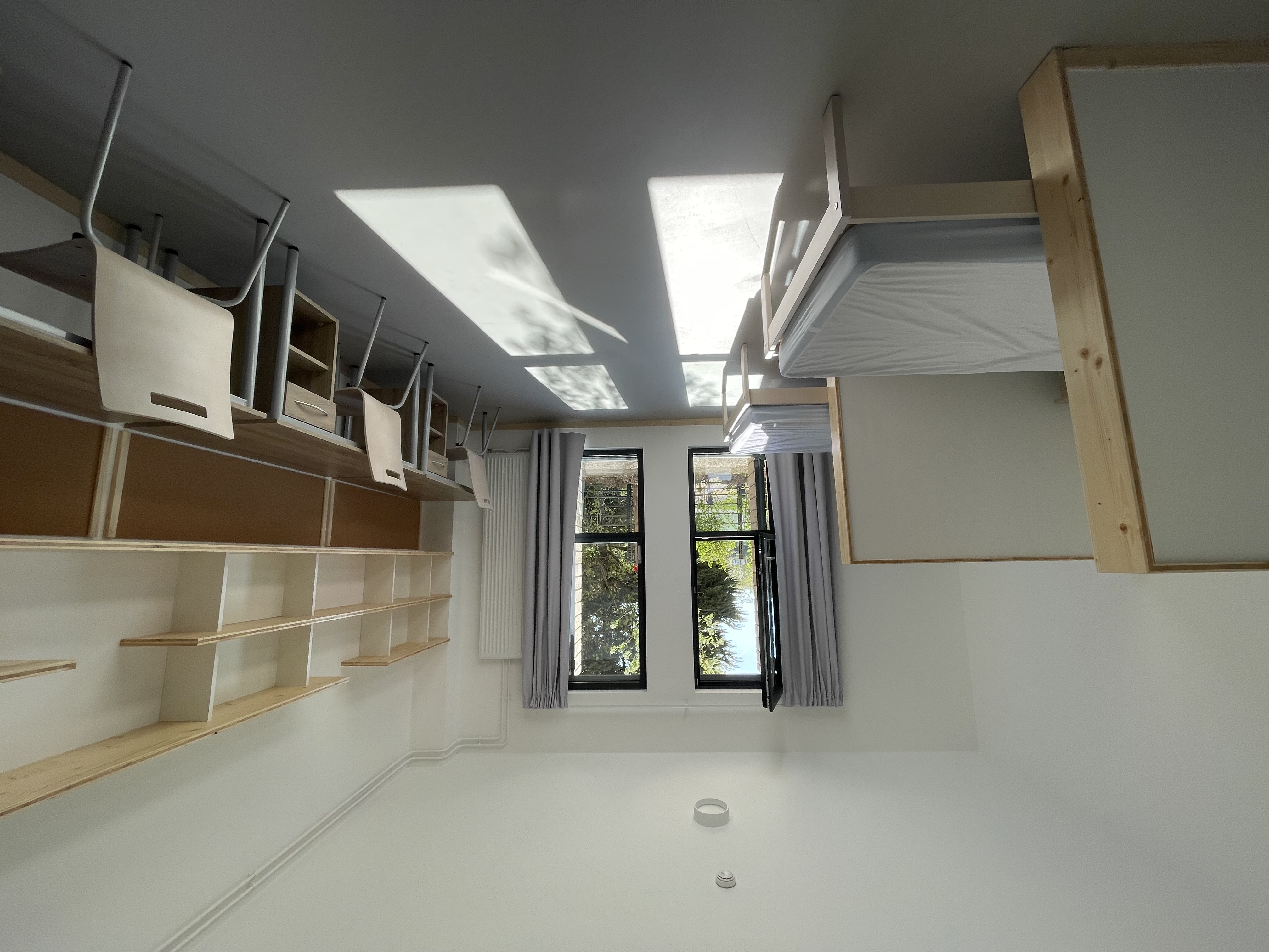 L’ organisation de l’internat s’inspire d’une organisation en village plutôt qu’en un bâtiment unique. Des bâtiments épannelés en RDC et R+1 sont implantés sur la parcelle. Ainsi, l’internat n’est pas seulement constitué d’un ensemble de bâtiments mais il offre aux usagers un cadre de vie à travers des espaces extérieurs, des cheminements, un paysage, en bref un espace qualitatif, protégé du reste de la ville.