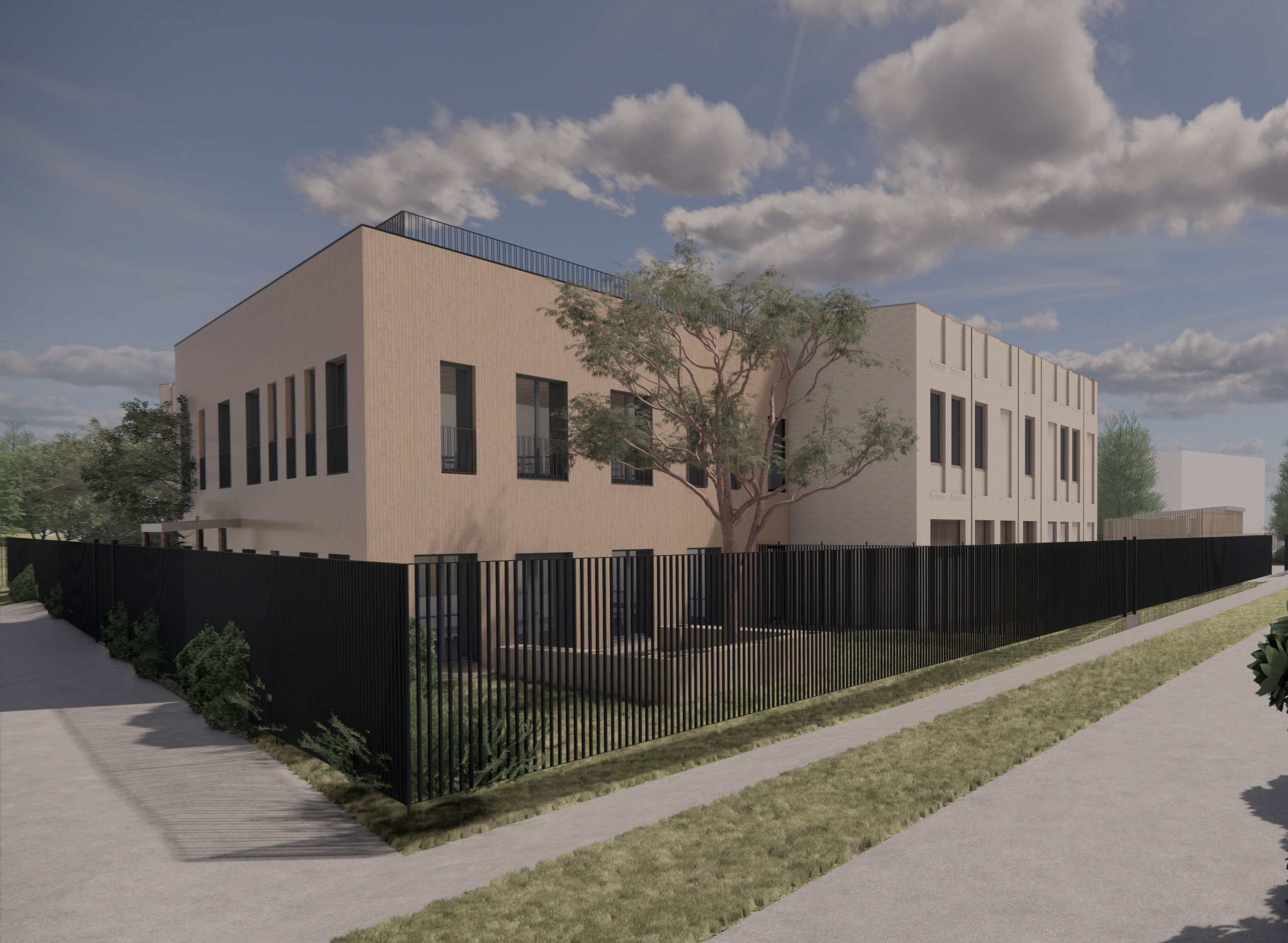 Les façades du volume principal sont composées de briques pleines jaune rosé, un matériau qui permet une intégration élégante et durable dans le paysage urbain environnant, rappelant l’aspect minéral des bâ¬timents existants et leur teinte. Le volume secondaire se distingue par une différence de matérialité, de traitement des ouvertures et de son couronnement. Un garde-corps en serrurerie, identique à ceux des fenêtres de l’étage, surmonte la façade en bardage bois.