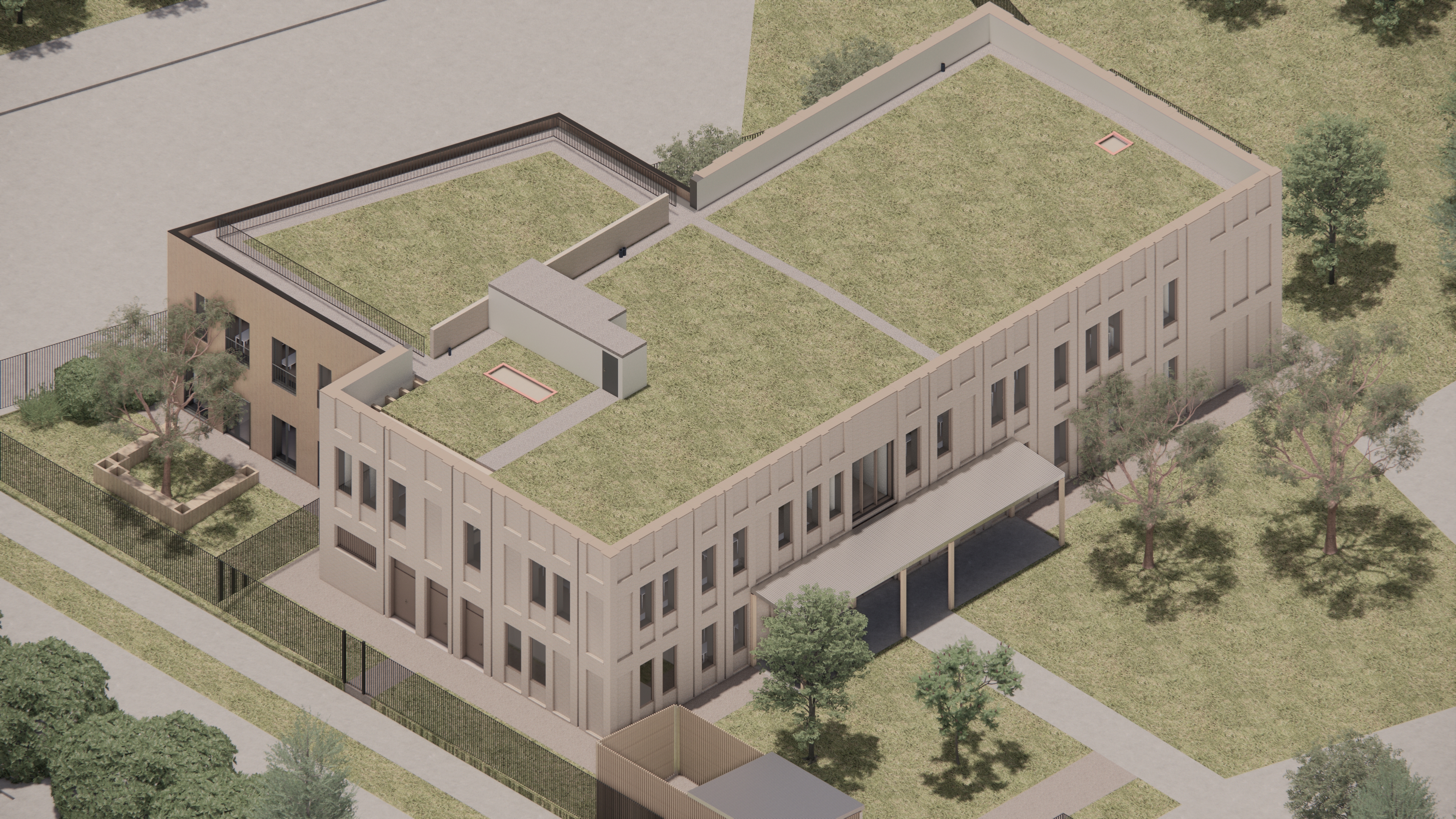 La restructuration du pôle des métiers de la sécurité du lycée professionnel du Vexin nous amène à concevoir un nouvel édifice dans l’enceinte de l’établissement. Celui-ci fait l’angle de la parcelle et profite de cette situation pour la maîtrise des différents flux : les enseignants et élèves entrent dans le volume dédié aux cours par le cœur de la parcelle, tandis que les usagers extérieurs ponctuels accèdent à un espace de fabrication numérique clairement délimité, directement depuis l‘espace public.