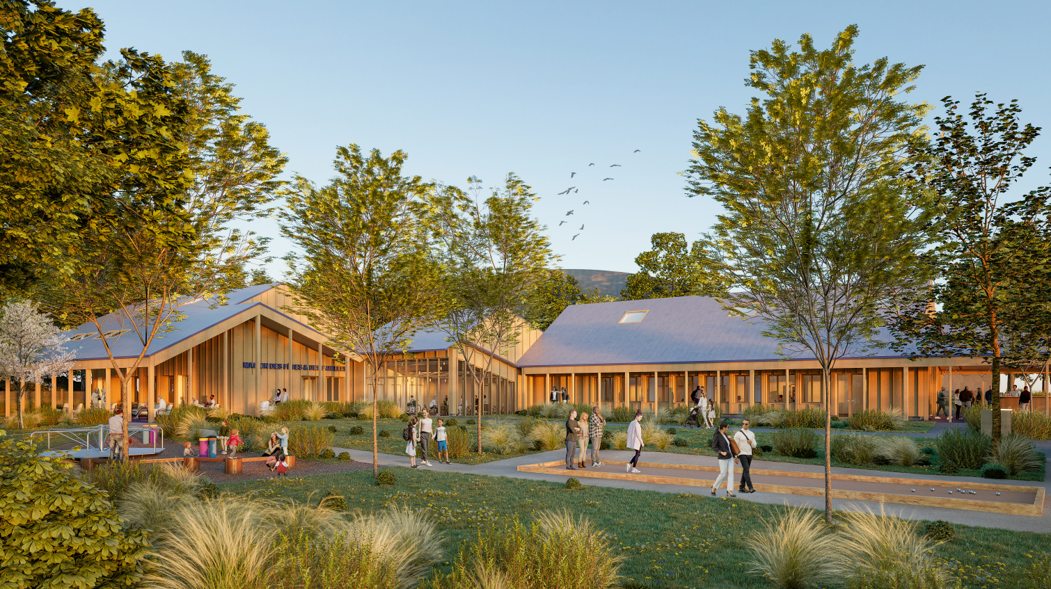 L’utilisation du bois pour la structure du bâtiment comme pour l’habillage des façades est omniprésente et confère à l’équipement un caractère chaleureux et accueillant. Cela lui donne une identité que les usagers sauront apprécier dès le premier contact avec la Maison des Fêtes et des Familles. Cette identité est accentuée par l’insertion du bâtiment dans son environnement proche.